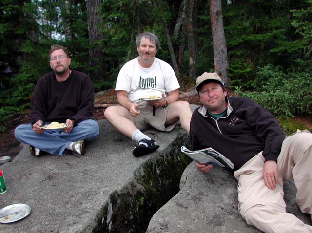 This time there was another party across the lake from us, but we could barely tell they were there. We cooked our last meal of pasta with sun-dried tomatoes, basil and pine nuts. The now familiar rock served as our dining room. We hit the tents early for a well deserved rest. Copyright 2002 by Richard Rathe & Family |