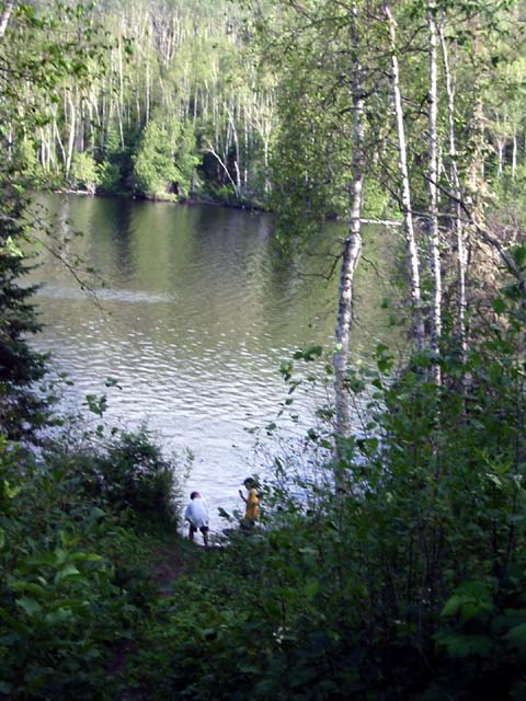 BWCA Canoe Trip Two Harbors, Brimson & Grand Marais Our trip began at the Minneapolis airport. Diana, Theron and Richard headed north in a rented car. The first stop was Two Harbors to take in some music at the annual folk festival. The city park is right down by the water with a great view of the lighthouse and ore docks. We met up with Peter and Karen Berger, relaxed on the lawn and listened to music. Just before dusk an ore boat came in. We got to watch the entire loading process as dozens of rail cars dumped their contents down a series of slides into the boat's hold. After dark we headed up Highway 2. Peter and Karen live at the end of a dead end road surrounded by national forest near the town of Brimson. Their property was all part of a Finnish homestead from the 1920s. In the morning we loaded up the canoe and made our way to Grand Marais. Remarkably, we arrived at the ranger station within minutes of Bruce, Mark and Austin. After doing a bit of last minute shopping we drove up the Gunflint Trail and camped in a USFS campground. The rest of the evening was spent packing and repacking. We had a nice meal of brats and hot dogs cooked over a campfire. The route we planned to take had several long portages. As it turned out we opted to retrace our steps and camp twice on Horseshoe Lake. The numbered green triangles indicate our actual campsites. The lighter gray line and starred triangle indicate the part we skipped. The orange circles indicate portages. In the end we paddled approximately 20 miles and carried our gear over 12 portages. Copyright 2002 by Richard Rathe & Family |